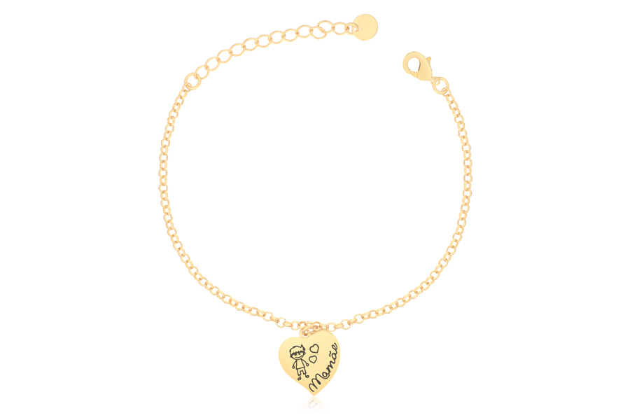 PULSEIRA BANHADA EM OURO, ELO PORTUGUÊS 2,50mm, 17cm COMPRIMENTO, EXTENSOR 4cm E CORAÇÃO MAMÃE MENINO 14mm LARGURA
