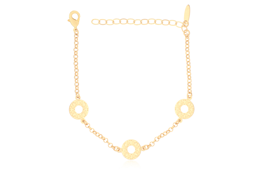 PULSEIRA INFANTIL BANHADA EM OURO, ELO DUPLO 1,80mm E CARTIER 3,50x1,90mm, 15cm COMPRIMENTO, CORAÇÃO, ANJO E CHAVE