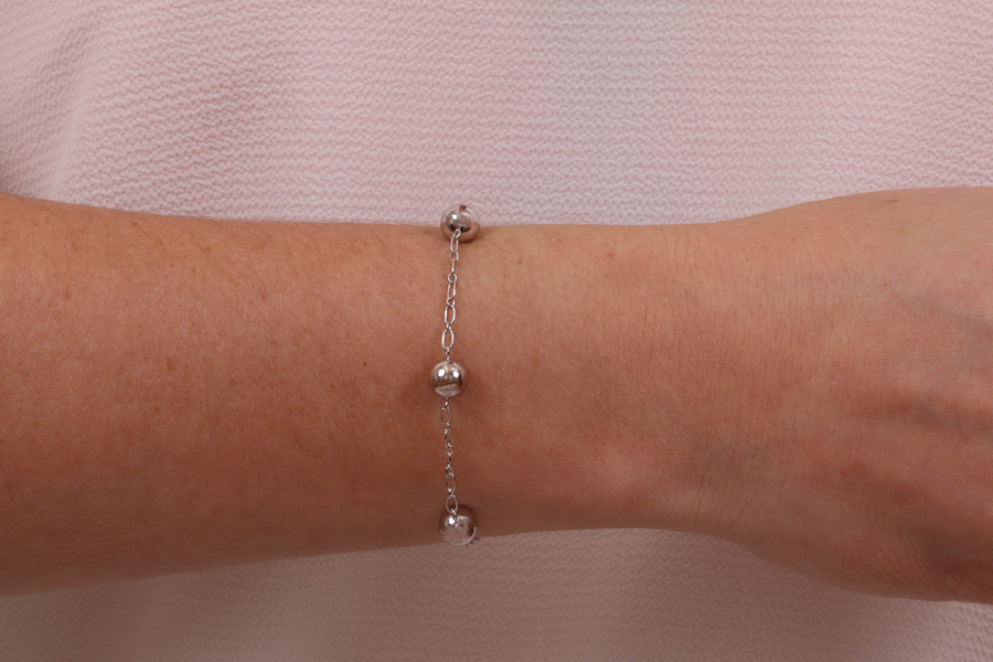 PULSEIRA BANHADA EM RÓDIO BRANCO, ELO 2mm LARGURA, 18cm COMPRIMENTO, EXTENSOR 1cm E 5 ESFERAS 7mm