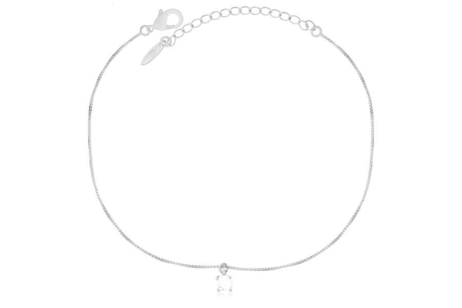 TORNOZELEIRA BANHADA EM PRATA LEVE, ELO VENEZIANA 0,80mm, 23cm COMPRIMENTO, EXTENSOR 5cm E PONTO DE LUZ 5mm