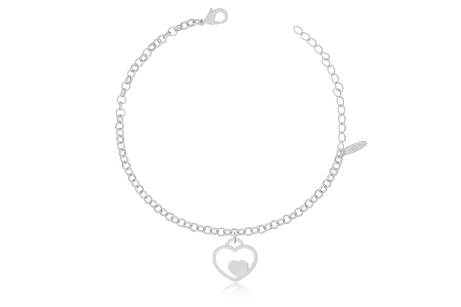 PULSEIRA BANHADA EM RÓDIO BRANCO, ELO PORTUGUÊS 3mm, 16cm COMPRIMENTO, EXTENSOR 5cm E CORAÇÃO VAZADO 17mm LARGURA