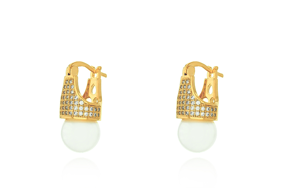 BRINCO BANHADO EM OURO, FLOR 22mm LARGURA COM PÉROLA SHELL 4mm E PONTO DE LUZ 4,50mm LARGURA