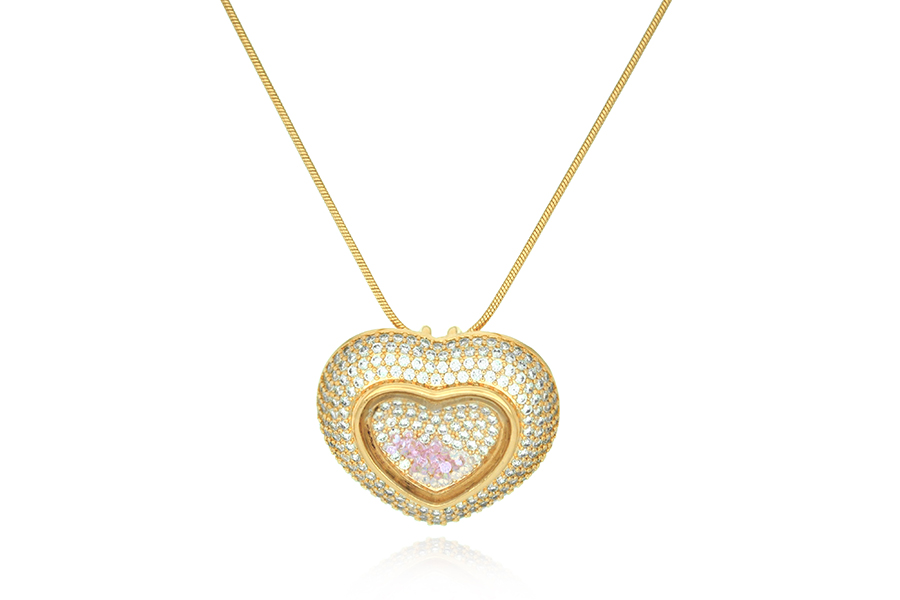 GARGANTILHA BANHADA EM OURO, ELO 1,10mm LARGURA, 80cm COMPRIMENTO, CORAÇÃO 9mm LARGURA E QUADRADO 17x13mm COM CORAÇÃO