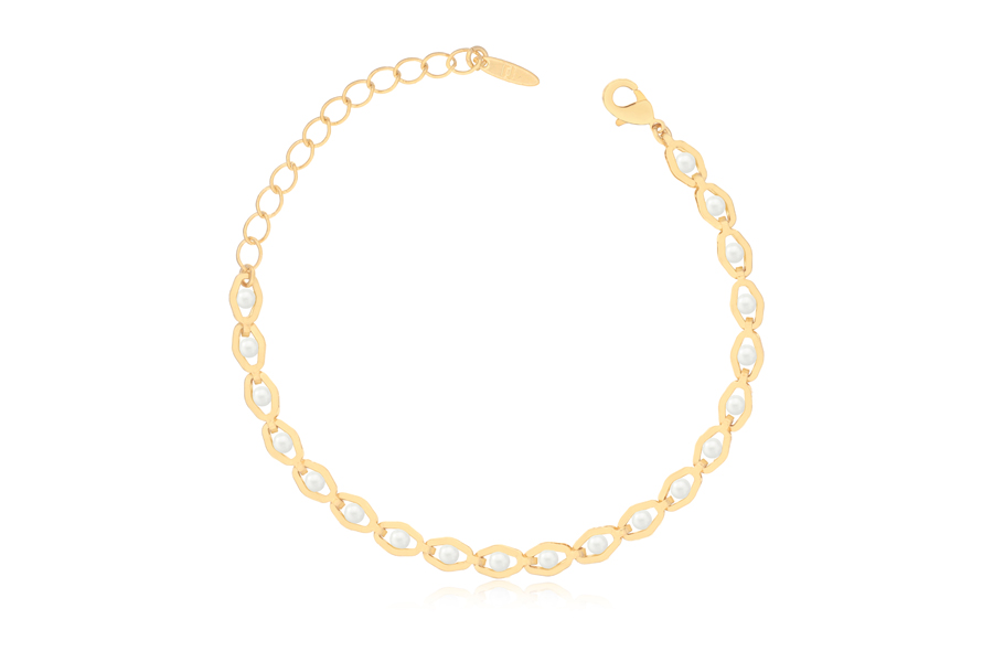 PULSEIRA BANHADA EM OURO, ELO 4,60mm LARGURA COM PÉROLAS, 16cm COMPRIMENTO E EXTENSOR 5cm