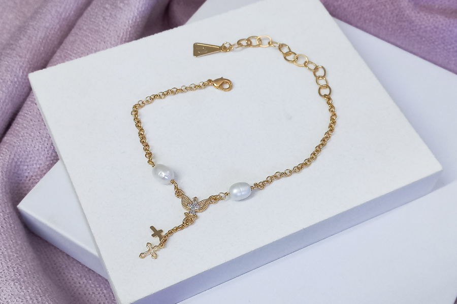 PULSEIRA BANHADA EM OURO, 2 PÉROLAS BARROCAS 6mm, DIVINO ESPÍRITO SANTO E CRUZ, ELO PORTUGUÊS, 16cm COMPRIMENTO