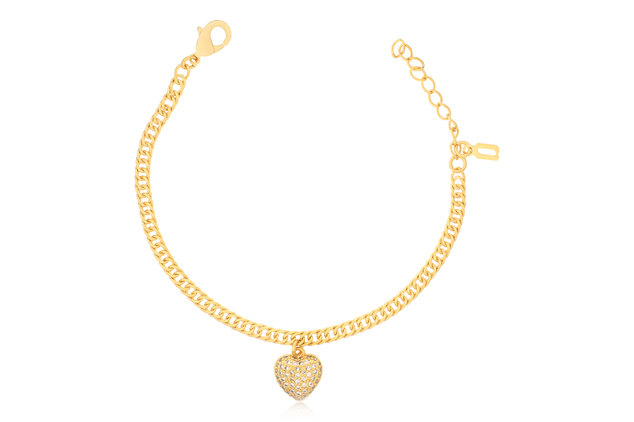 PULSEIRA BANHADA EM OURO, INFANTIL, ELO GRUMET DUPLO 3mm LARGURA, CORAÇÃO 9mm LARGURA, 13cm COMPRIMENTO E EXTENSOR 3cm COMPRIMENTO