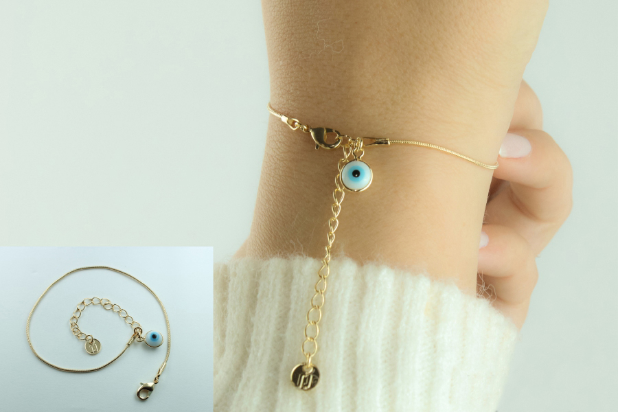 PULSEIRA BANHADA EM OURO, OLHO GREGO 7mm DIÂMETRO, ELO RABO DE RATO 1mm ESPESSURA